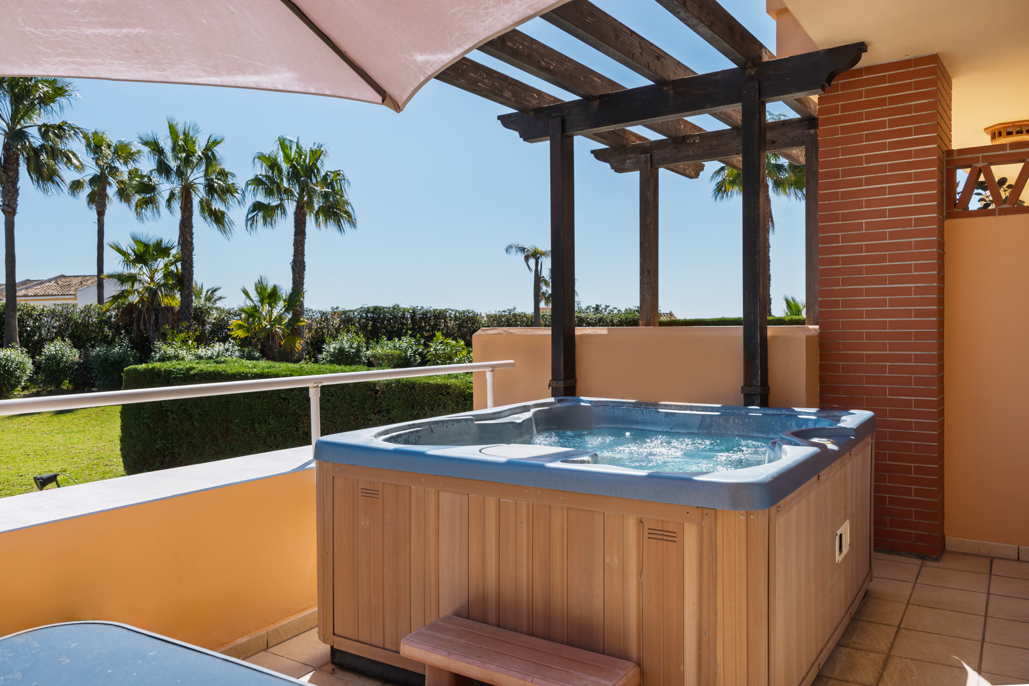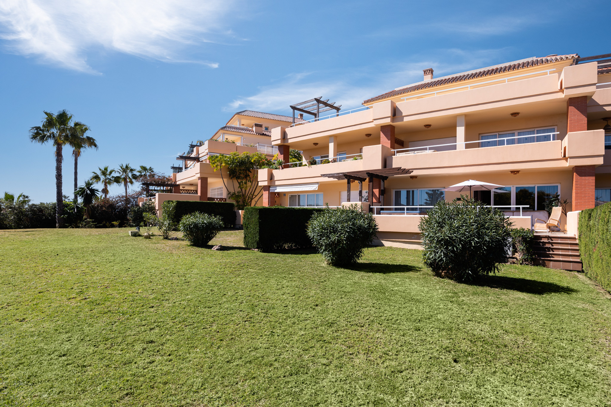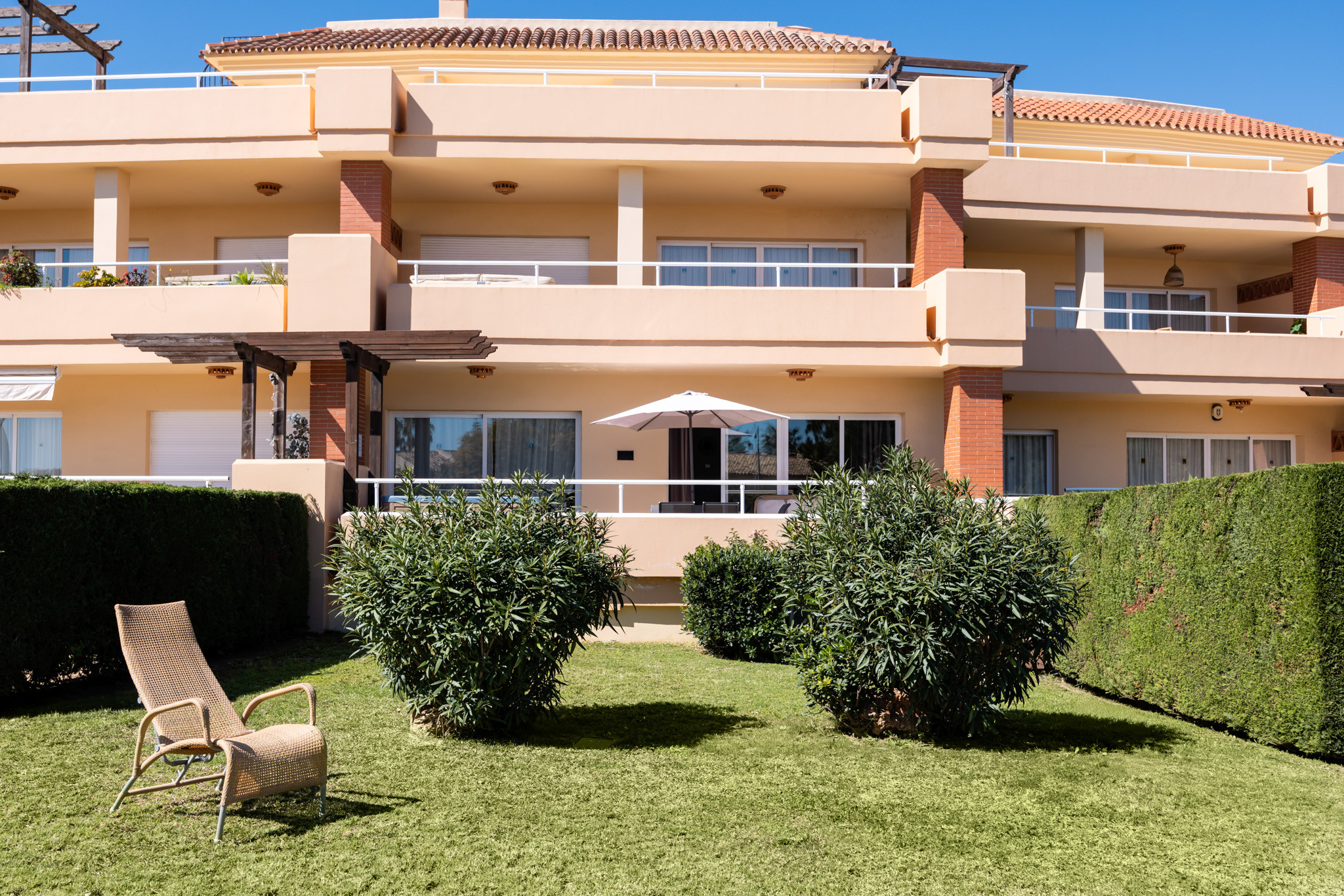El exterior es un verdadero paraíso. Un jardín cuidado y una terraza con muebles de jardín invitan a disfrutar de momentos de relajación con vistas a la montaña y los jardines circundantes. La urbanización cuenta con piscinas compartidas, incluyendo una piscina estándar para niños y otra climatizada, perfectas para refrescarse en los días calurosos.