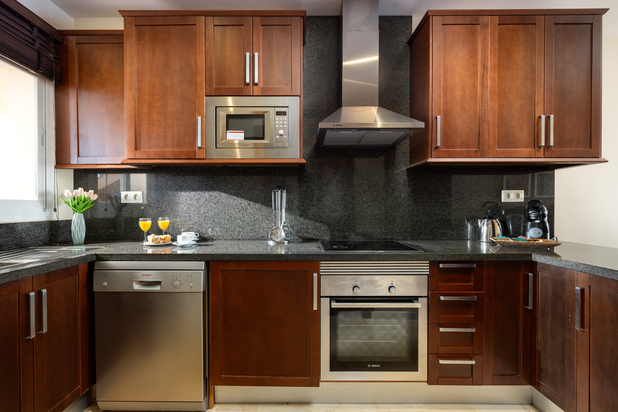 In the vitroceramic independent kitchen there is a refrigerator, microwave, oven, freezer, washing machine, dishwasher, dishes/cutlery, kitchen utensils, coffee maker, toaster and water heater.