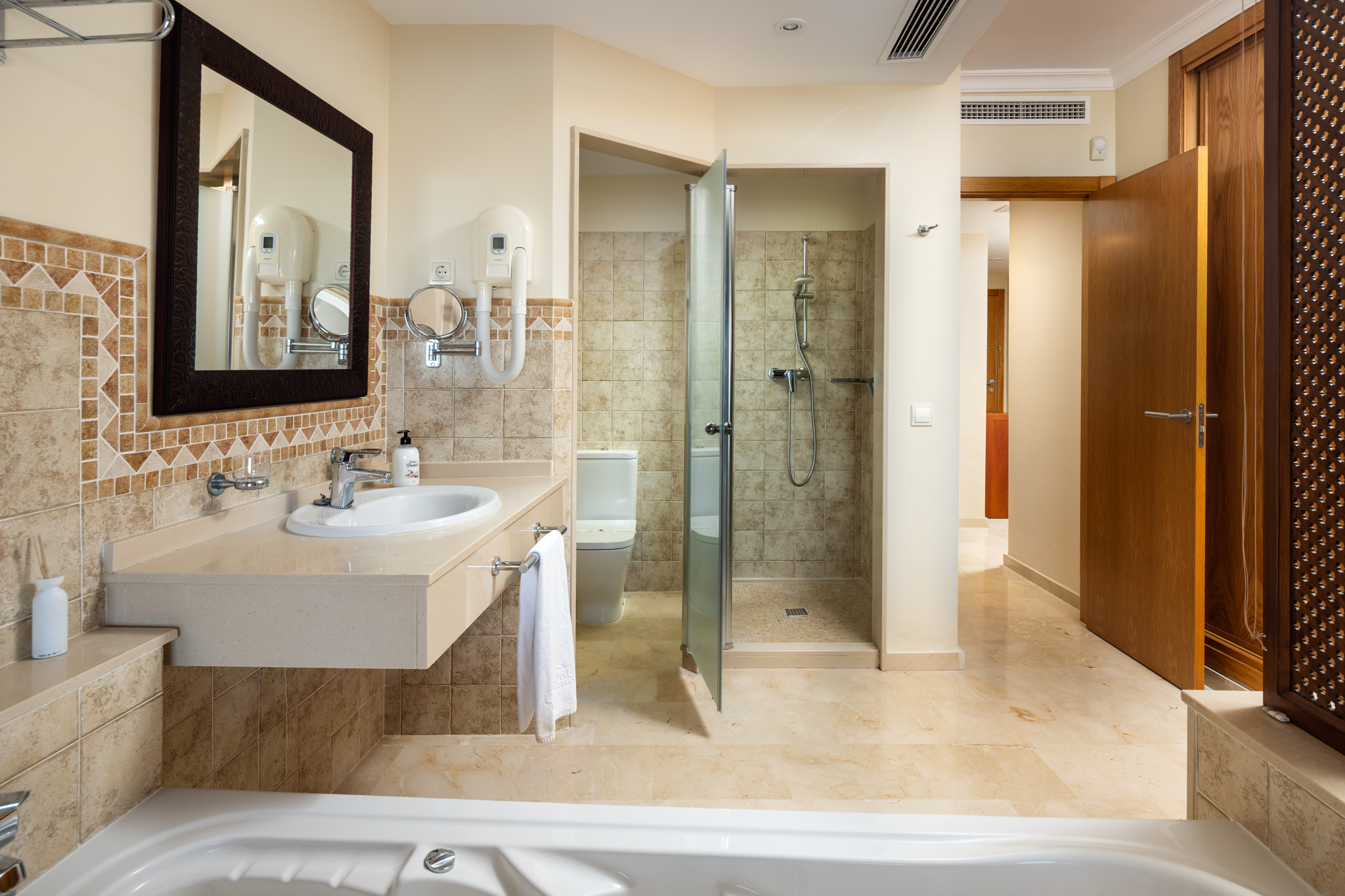 The apartment features two spacious bedrooms and two full bathrooms, including a master en-suite with a hydromassage bathtub, ideal for unwinding after a day at the beach or exploring the area. The interiors are thoughtfully designed to provide a refined yet welcoming atmosphere, ensuring maximum comfort throughout your stay.